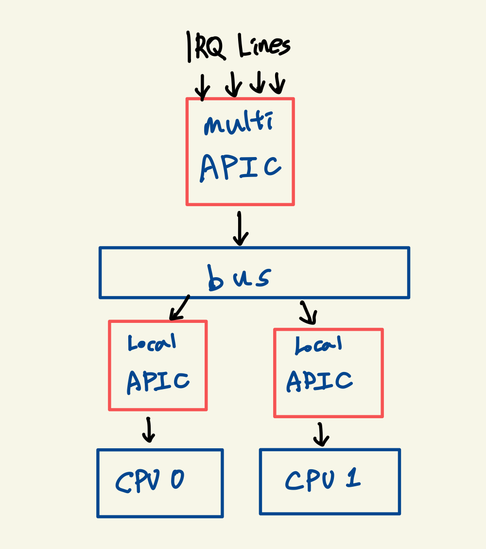 모든 I/O장치들이 Multi APIC에 요청하고, 이 Multi APIC는 아까 봤던 PIC와 비슷한 역할을 합니다.