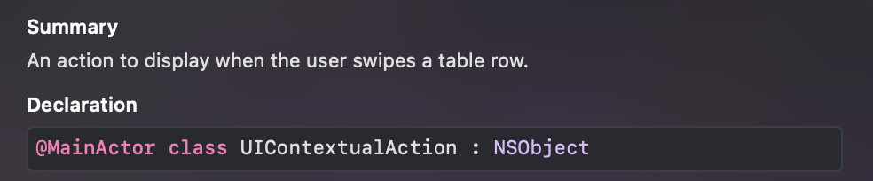 UIContextualAction은 다음과 같이, 유저가 cell의 row를 스와이프 했을 때 일어나는 액션을 정의한다.