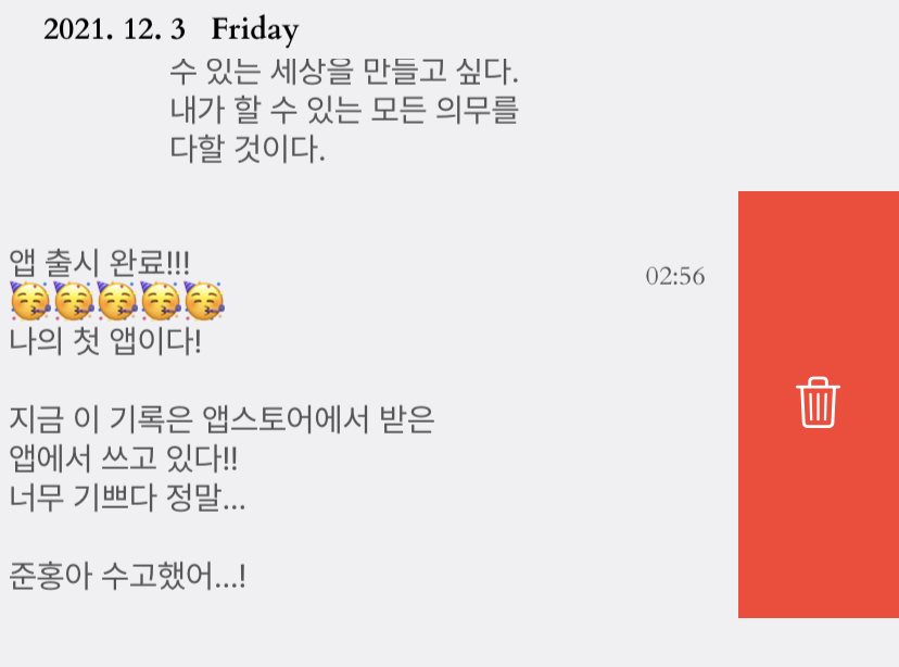 스와이프 하면 다음과 같은 삭제 버튼이 나타나게 됩니다.